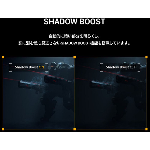ASUS Dynamic Shadow Boostソフトウェアは、自動的に暗い部分を明るくし、暗い場所に隠れている敵を見つけやすくします。