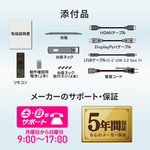 付属品:電源コード(PSE適合品)、DisplayPortケーブル、HDMIケーブル、USBケーブル(C-C USB 3.2 Gen 1)、台座、台座ネック、台座ネック取付ネジ(4本)、リモコン、動作確認用電池(2本)、取扱説明書
