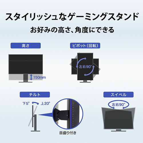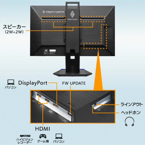 応答速度の速いTNパネルを採用し、全ポート最大240Hzの高リフレッシュレートに対応した24.5型ゲーミングモニター「GigaCrysta」。応答速度0.4ms[GTG]、内部遅延時間が「約0.09フレーム(約0.37ミリ秒)」と低遅延モードを実現。さらに残像を低減する機能も搭載ています。