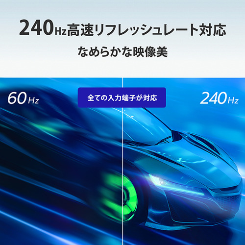 HDMI×2、DisplayPortすべての入力端子で最大240Hzの高速リフレッシュレート対応。1秒間に最大240回映像を書き換えるので一般的な60Hzのディスプレイの4倍、144Hz対応のゲーミングディスプレイの約1.6倍も高速に映像を表示させます。※240Hzの出力に対応した機器が必要。