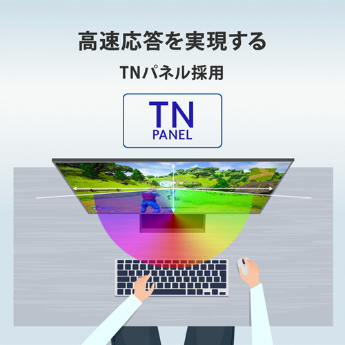 一般的なIPS、ADS方式のパネルと比べ、TNパネルは応答速度が速く、より残像感の少ない明瞭な映像表示が可能です。FPSゲームに最適なパネルとなり、ゲームプレイ時に、振り向きによる視点変化やインファイト中の激しい動きでも有利になる設計となっています。