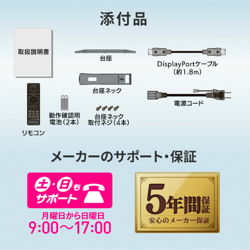 付属品:電源コード(PSE適合品)、DisplayPortケーブル(約1.8m)、台座、台座ネック、台座ネック取付ネジ(4本)、リモコン、動作確認用電池×2、取扱説明書