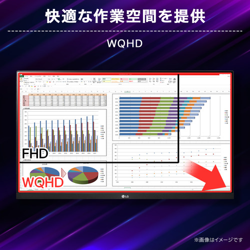 フルHDの約1.8倍の解像度となる2560×1440(WQHD)が快適な作業空間と高精細な映像表示を提供します。