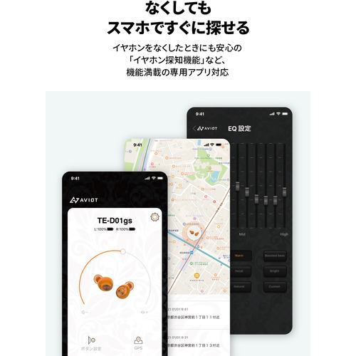 他にも、アプリ「AVIOT SOUND XXX」を使えば、音質を自分好みに調整できる10バンドのイコライザー ( =EQ ) 設定や、ボタン操作のカスタマイズなど、さまざまな機能を搭載。