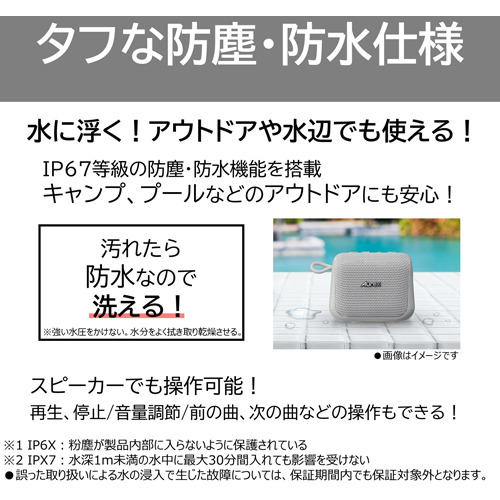 IP67の防水・防塵仕様。水に浮くので、アウトドアや水辺でも使えるタフなスピーカーです。