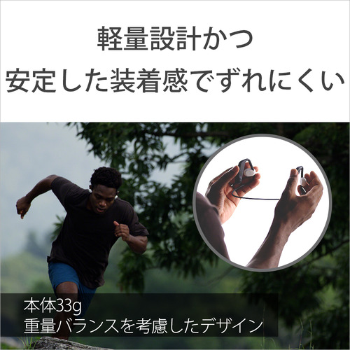 IPX4相当の防滴性能 (*)により、スポーツ中の汗や突然の雨でも、安心して音楽を楽しめます。さらに、約33gの軽量設計にも関わらず、最長10時間のバッテリー搭載など、使い勝手のいい基本性能を数多く搭載しています。* IPX4(飛沫に対する保護等級):あらゆる方向からの、飛沫に対して本体機能を保護するものです。USB Type-C端子のフタが安全に閉まっている状態であること