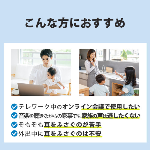 オフィスでも自宅でも使えるよう、マイクを搭載しました。ご自身の声は自然に聴こえつつ、同僚や家族の声もクリアに聞こえるため、より幅広いシーンでお使いいただけます。 【仕様】