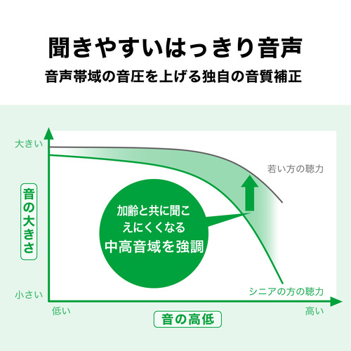 音声に近い周波数帯域を補強することで、聞き取りやすい音質に調整しています。