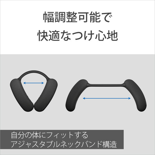 ネックバンド部の幅調整が可能なアジャスタブルネックバンド機構を採用し、お客様の体形に合わせて使用いただけます。ネックバンド部は、形状記憶用の特殊素材が使われており、これにより快適な装着性を実現しています。またコンパクトボディながら最長12時間(*)再生のロングバッテリーで動画の一気見などでの長時間使用時も安心です。* 当社規定の音源を使用し、本機の音量をVol.16に設定した場合の再生時間です。再生する音量や楽曲、周囲の温度や使用状況により、上記の時間と異なる場合があります。 内蔵充電池充電時間(周囲の温度が5-35℃で、出力電流が1.5A以上のUSB ACアダプターに接続した場合