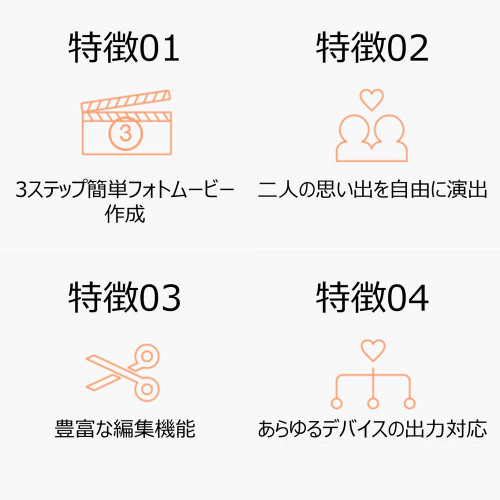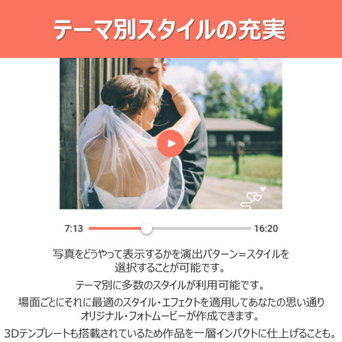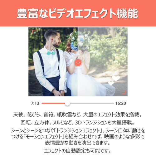ウェディングテンプレート満載!ムービー作りは超カンタン!写真・ビデオを選ぶ映画監督気分で写真・ビデオ素材を表示順に並べたら、自動演出機能で、ほぼ作品完成!素材がイキイキと動き出します。演出・編集オープニングやエンディング画面を豊富なプリセットから選択。こだわり派は「演出パターン」を手動で指定。BGM、ナレーション、テキスト、クリップアート、エフェクトを自由に追加。また、色々な動きのエンドロールが作れます! 【動作環境】