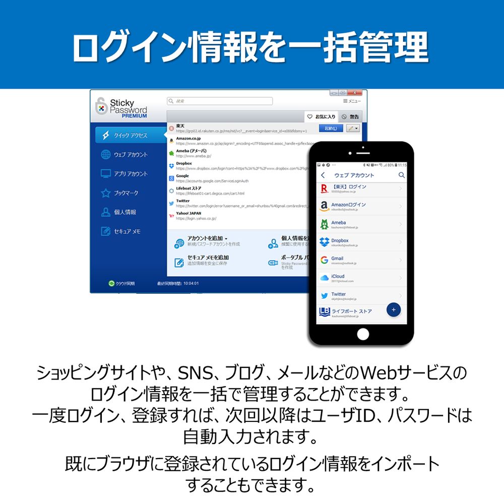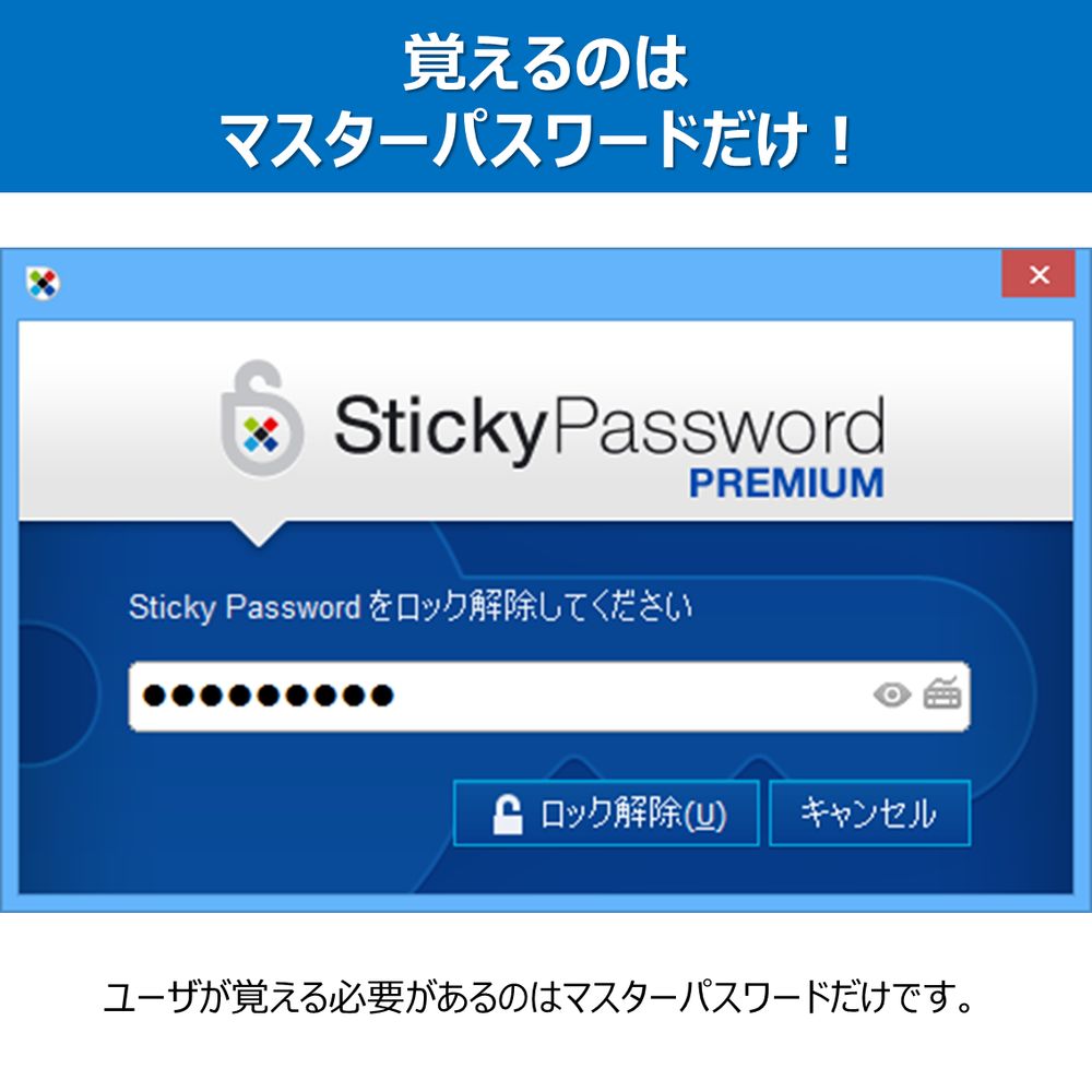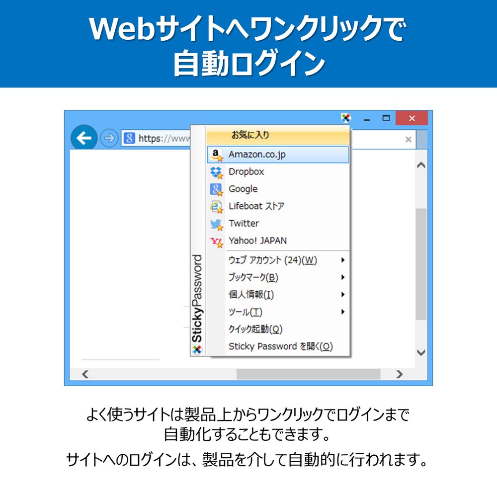 「Sticky Password プレミアム」は、PC、タブレット、スマートフォン対応のパスワード管理ソフトで、Webサイトやアプリケーションで入力が必要なユーザIDやパスワードを暗号化して安全に保管します。自動入力でのログインも可能で、マスターパスワードさえ覚えておけば、様々なサイトに簡単、安全にログインすることができるため、増え続けるパスワード管理に最適です。1ユーザでご利用いただく場合、台数無制限で無期限にご利用いただくことができます。