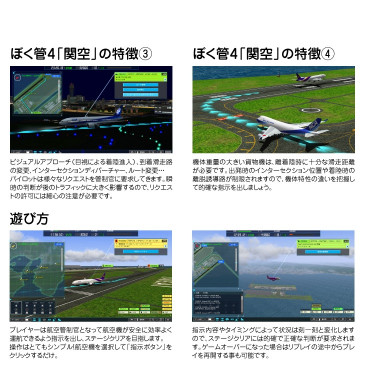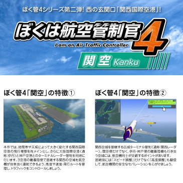 ぼく管4シリーズ第二弾の舞台は、西の玄関口「関西国際空港」(通称:関空)。関空は国際色豊かな航空機が飛び交う24時間運用の国際空港です。管制官は関空便のみならず、その空域を飛行する大阪国際空港・神戸空港等の離着陸機も管制する「広域管制」をおこなっています。本作ではその広域管制で混雑する空域を再現!パイロットからの滑走路、ルート変更要請などの様々な「リクエスト」にも応えなければいけません。あなたの空間認識力と状況判断力が試されます。高度や速度、使用する滑走路やルートなどを指示して、安全な運航を目指しましょう。