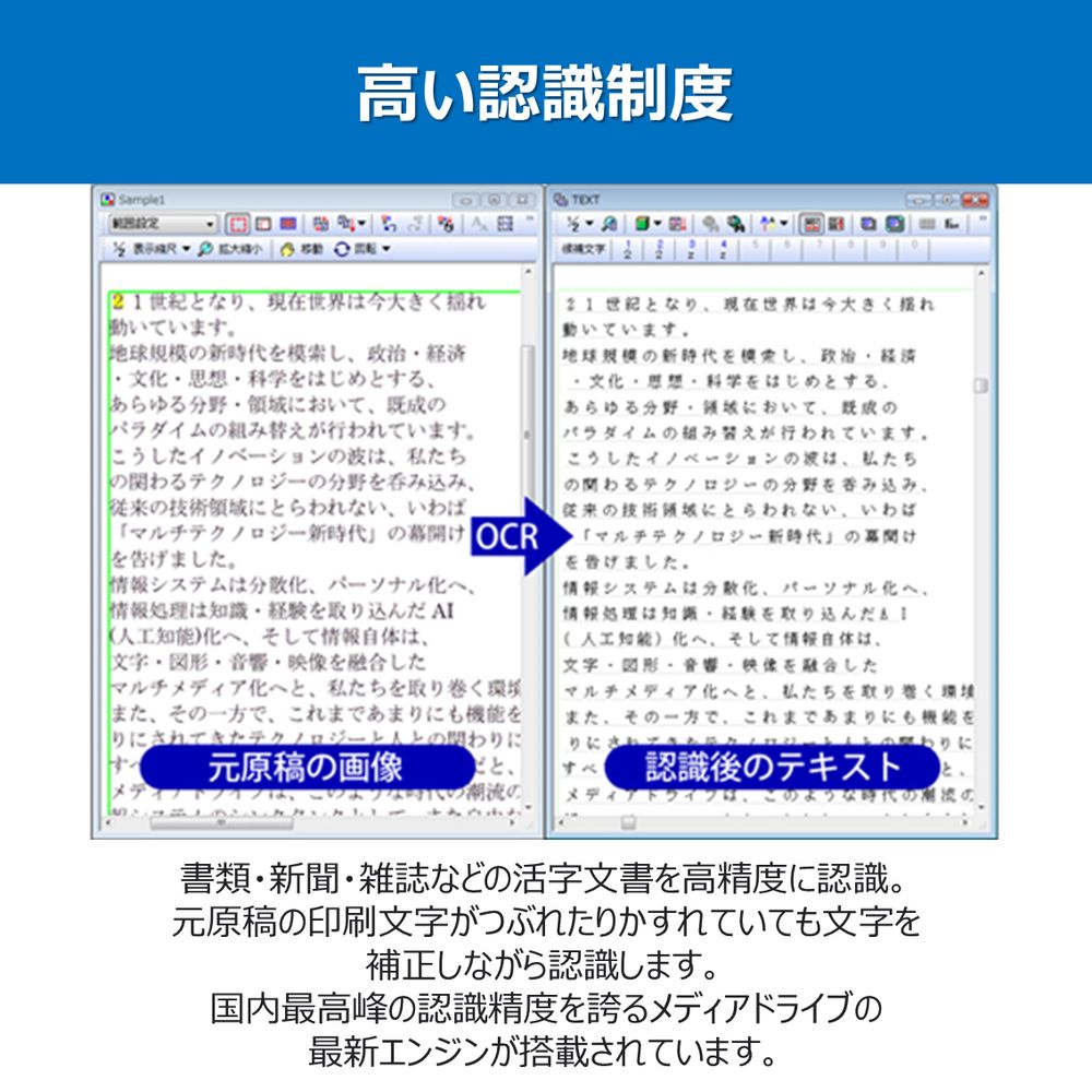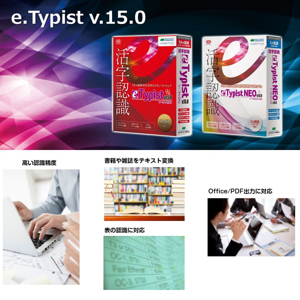 e.Typist シリーズを所有しているユーザ様向けのアップグレード版。スキャナバンドル版のe.Typist エントリーシリーズもアップグレード対象となります。認識エンジンを搭載。日本語エンジン:自社開発 英語エンジン:ニュアンス社製。認識結果の再現性を強化。文書中の「写真」「グラフ」を優先的に図領域とし抽出するモードを追加することで、全体のレイアウト再現性が大幅に向上。Wordへ出力は、「テキストボックス」ではなく「段組み」状態での出力が可能に。