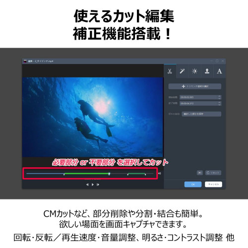 PC画面に表示された映像/音声は「何でも」録画/録音!。・フルハイビジョン・4K解像度対応!。・録画エリア指定(全画面/ウィンドウ/部分囲み)。欲しい動画&音楽をすぐ発見!ダウンロード or 録画・録音。・独自の検索で世界中から発見!。・ダウンロードもしくは、録画/録音で保存。・楽曲情報自動取得。・ストリーミングやラジオをプレイリストに保存。・タイマー録画/録音対応。編集機能搭載。・CMカット/部分削除/分割/結合。・音声波形編集。・動画から音声抽出、音楽形式で保存。iTunesへ直接転送。DVD対応プレーヤーとDVD作成ソフト付属