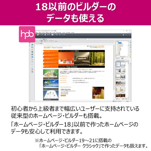 PC・スマートフォン用ホームページ作成ソフトの決定版。HTMLの知識がなくてもマウス操作で直感的に操作・編集できる「ホームページ・ビルダー SP」と、従来型の「ホームページ・ビルダー クラシック」を搭載。ビジネスプレミアムではテンプレートを352種、写真・イラスト素材を計2、576点に大増量。新登場「ロングスクロールSPテンプレート」は、1ページに情報を集約したデザインで成果につながるホームページを目指します。SEO対策ソフト「SEO Composer」「Sitemep Creator」付属。