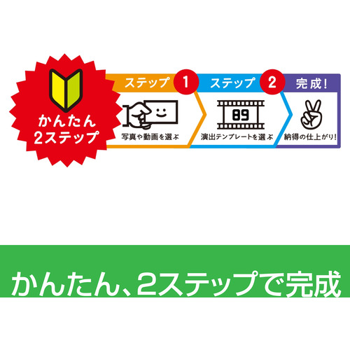 ステップ1:写真や動画を選ぶ ステップ2:演出テンプレートを選ぶ→完成