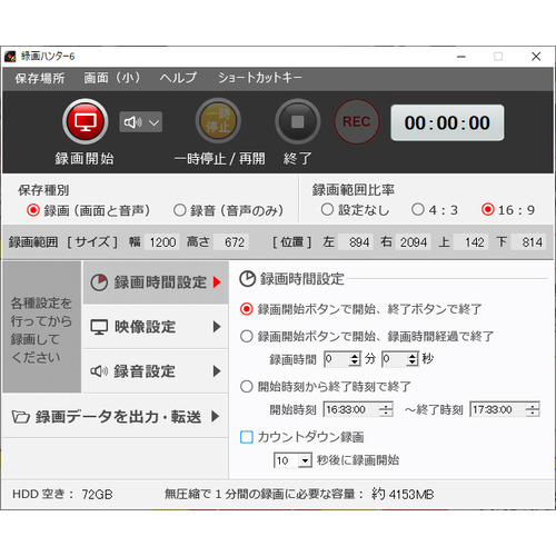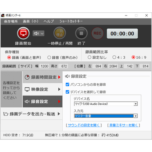 録画したい範囲をマウスで囲み、保存設定をするだけですぐに録画できます。