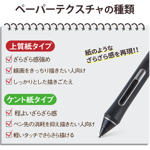 ●ワコムペンタブレット Intuos Pro(Medium)/Intuos Pro Paper Edition(Medium)の操作面を傷や汚れから守る、指紋防止、反射防止タイプの紙心地フィルムです。特殊表面形状デザインによりケント紙に鉛筆で描いたような描き心地を実現します。