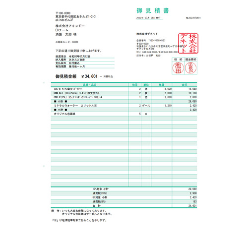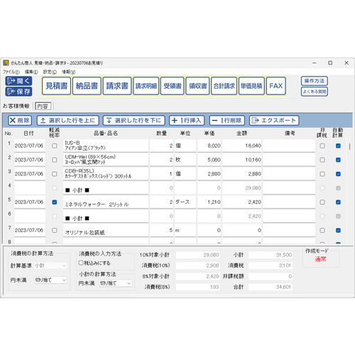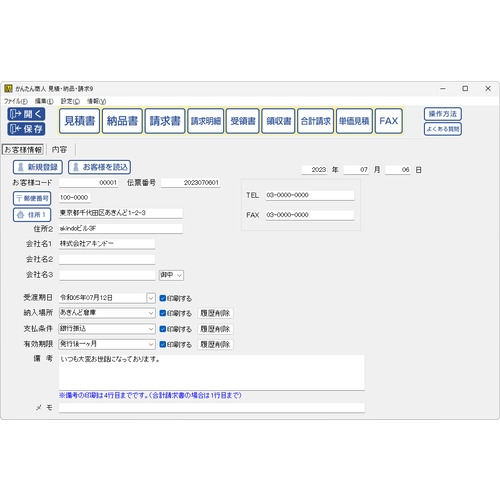 ●取引先の情報を入力して品名・数量・単価・金額など明細を入力するだけで自動計算された帳票を印刷できる他、作成した帳票をPDFファイルや画像ファイルで出力してメールで送ることも可能です。