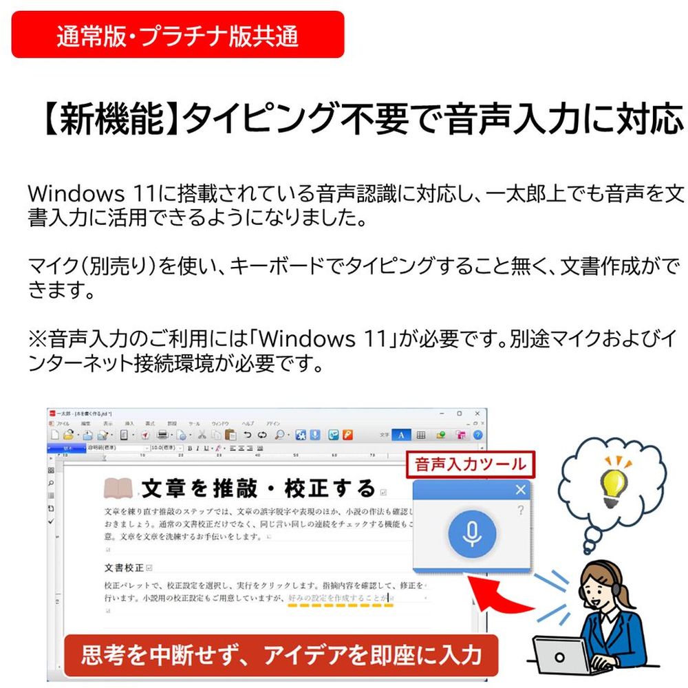 その他動作条件:※音声入力のご利用は、Windows11のみで動作します。Windows10ではご利用になれません。また、マイクおよびインターネット接続環境が必要です。