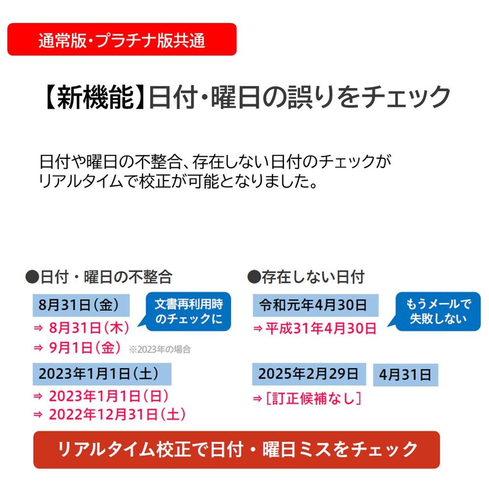 定型文書を素早く登録し呼び出せる「ATOK@ブンコレ」や、校正エディターが強化された「JUSTチェッカー」など、正しく的確に文書を作成するための機能を多数搭載しています。