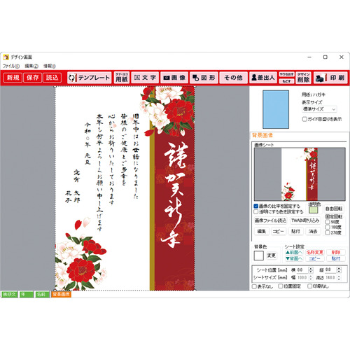 年賀状、暑中見舞い、季節ごとの挨拶状や引越し、出産等の報告ハガキを作成・印刷できる1年中使えるソフトです。