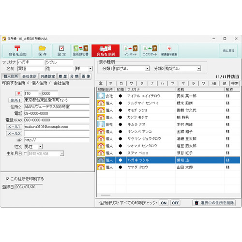 ●宛名を登録する住所録は、家族や個人用、会社用などの複数登録ができ、作成した住所録内の分類分けの設定もできます。