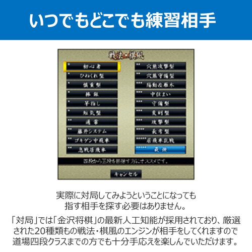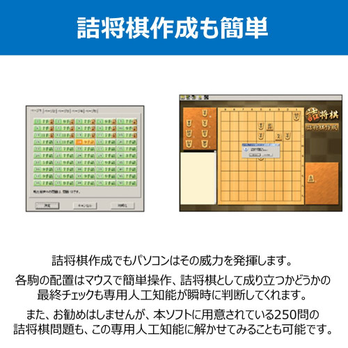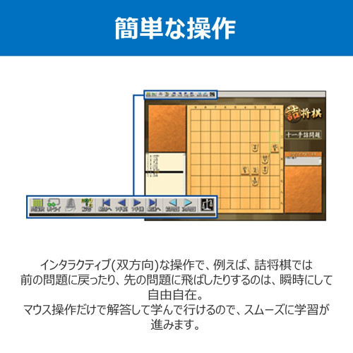 パソコンのメリットを活用して、面白さがわかってきた将棋ファンが更に上を目指すためのソフト。対象は2級-道場4段レベル。コンピュータの人工知能を相手にプレイする「対局」と上達のための練習問題「詰将棋」で構成。対局部分では厳選した20種類の金沢将棋の思考エンジンを採用。有段者でも納得出来る棋力。また、「指し直し」が可能で「もし違う手を指していたら、どう展開していたか」を体験できる。詰将棋は「詰将棋」と「詰将棋作成」から成り、関根九段作成の実力六級-二段クラスを想定した250問を用意。 【動作環境】