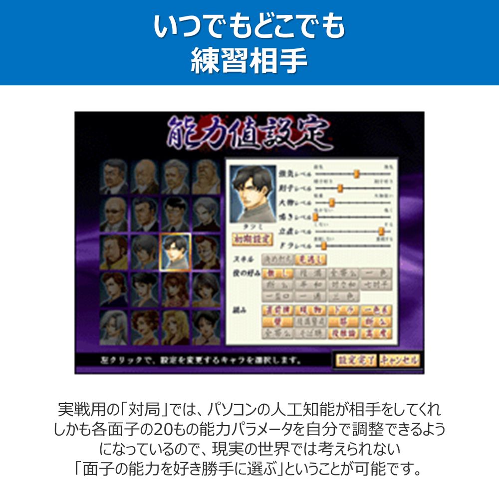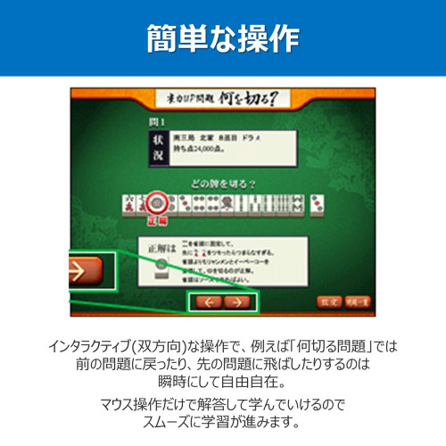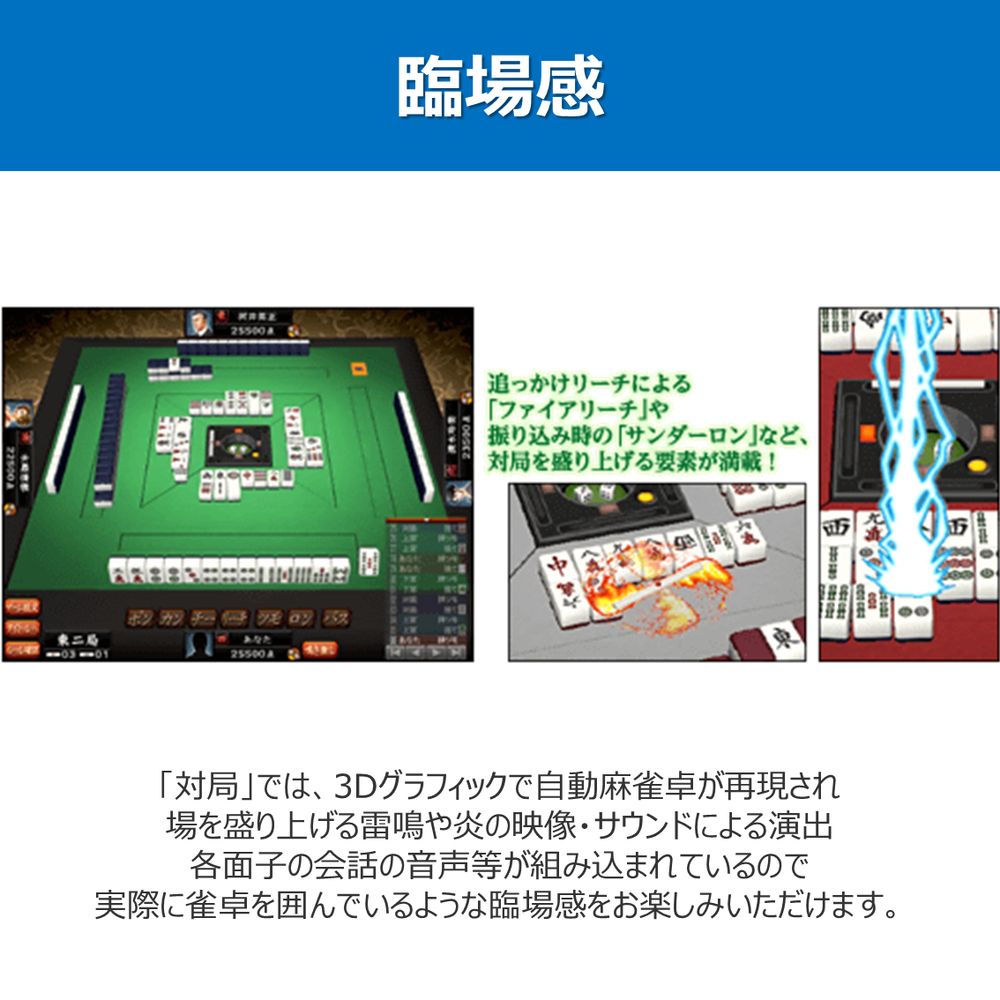 パソコンのメリットを徹底活用して、腕前にはある程度自信がある麻雀ファンが更に上を目指すためのソフト。コンピュータの人工知能を面子にプレイする「対局」と上達のための練習問題「何切る問題」から構成。対局部分は通常対局とトーナメント対局という構成。また、「打ち直し」が可能で「もし違う判断をしていたら、どう展開していたか」を体験できる。トーナメント対局では、20名の参加者から勝ち上がっていく体験を味わえる。いずれも3D自動動麻雀卓で臨場感満点のグラフィック。 【動作環境】