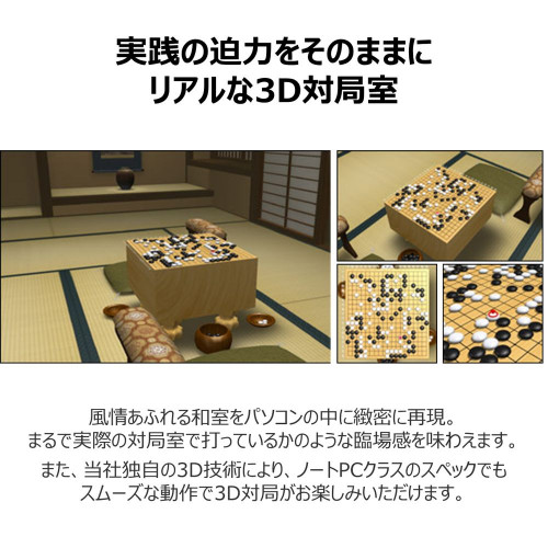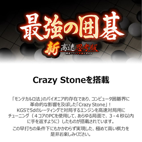 これでコンピュータ囲碁ソフトの常識が変わる!!Crazy Stoneを搭載。「モンテカルロ法」のパイオニア的存在であり、コンピュータ囲碁界に革命的な影響を及ぼした「Crazy Stone」!KGSで4dのレーティング(24コアのマシン使用)で対局するエンジンの高速対局用にチューニング(4コアのPCを使用して、あらゆる局面で3-4秒以内に手を返すようにチューニング)したものが搭載されています。この早打ちの条件下にもかかわらず実現した、極めて高い棋力を是非お楽しみ下さい。囲碁ソフトに似合わない超美麗、超自然の 【動作環境】