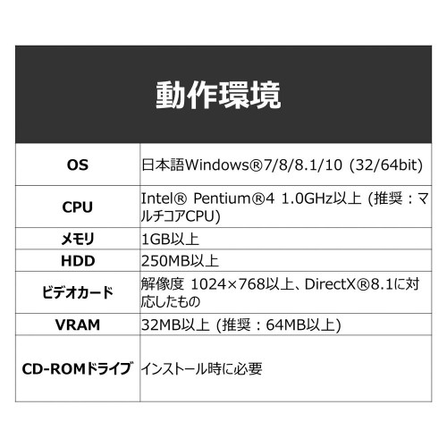 [対応OS]Windows XP/Vista/7(32/64bit) [CPU]Pentium4 1GHz以上 [メモリ]1GB以上 [HDD]250MB以上 【発売日】