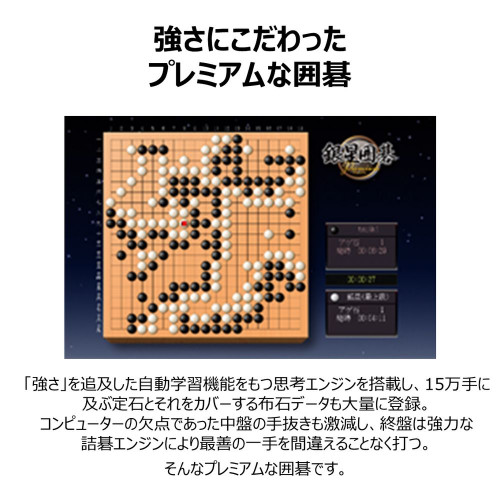 大人気の定番ゲーム3タイトルを1本に収録!!銀星囲碁Premium、銀星将棋Premium、最強銀星麻雀がひとつになった超お得セット