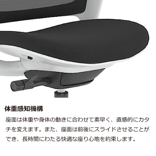 座面は体重や身体の動きに合わせて素早く、直感的にカタチを変えます。また、座面は前後にスライドさせることができ、長時間にわたる快適な座り心地を約束します。