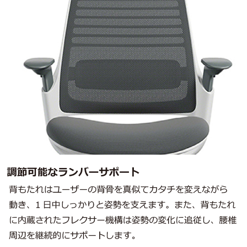 背もたれはユーザーの背骨を真似てカタチを変えながら動き、1日中しっかりと姿勢を支えます。また、背もたれに内蔵されたフレクサー機構は姿勢の変化に追従し、腰椎周辺を継続的にサポートします。