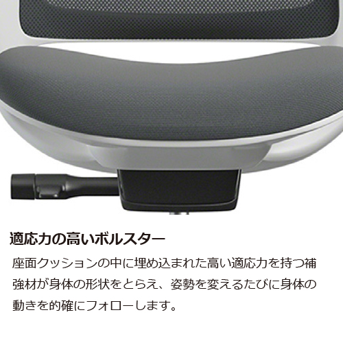 座面クッションの中に埋め込まれた高い適応力を持つ補強材が身体の形状をとらえ、姿勢を変えるたびに身体の動きを的確にフォローします。