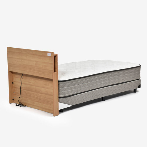 上部の棚にスマートフォンなどの小物を置けるほか、両側面には開口部(内寸:幅50x奥行200x高さ220mm※全サイズ共通)があり、本などが収納できます。上部には枕元をやさしく照らす間接照明(LED照明)と1口コンセントも付いており機能性も充実しています。