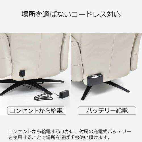 従来のコンセントを使用した給電だけではなく、付属する充電タイプのバッテリーを使用することで場所を選ばずにくつろぐことができます。