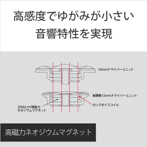 16mmドライバーユニットと同じサイズの300kJ/m3高磁力ネオジウムマグネットと、従来のボイスコイルよりも長く、マグネットとの接地を安定させるロングボイスコイルを採用。リニアリティの高い駆動系で、小型でありながら高感度で低歪な音響特性を実現します。