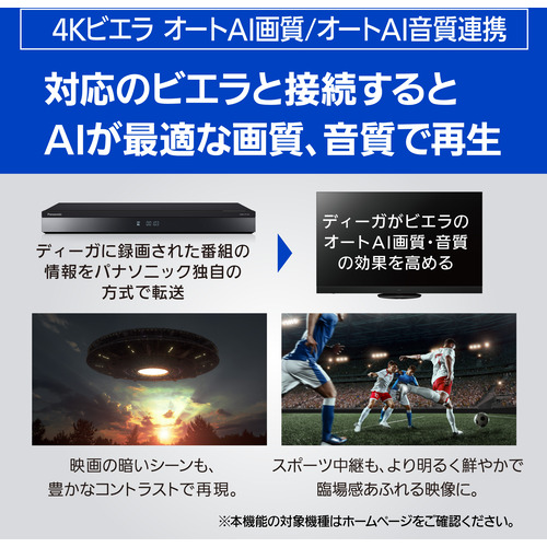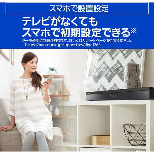 ・家でも外出先でも放送番組や録画番組・写真/動画・音楽も、スマートフォンで楽しめる。(※●放送中番組/録画済み番組の宅外リモート視聴:スマートフォンやタブレットと本シリーズを宅内ネットワークに接続してアプリにて機器登録(ペアリング)が必要です。90日間、宅内ネットワークに接続して使用しなかった場合はペアリング期限の更新が必要です。放送制限により視聴できないチャンネルがあります。●CD楽曲、写真/動画の宅外リモート視聴:スマートフォンやタブレットと本シリーズを宅内ネットワークに接続してアプリにて機器登録(ペアリング)が必要です。ペアリング期限の更新は不要です。●本シリーズに登録できる端末は最大6台ですが、外出先から同時に視聴できるのは1台のみです。本シリーズの使用状況によっては視聴できない場合があります。本シリーズを日本国内に設置のうえ、私的使用の範囲でお使いください。ご利用のネットワーク環境により、ファイアウォールや無線LANブロードバンドルーターの設定が必要になる場合があります。IPv4(PPPoE等)の接続環境でご使用ください。「v6プラス」、「transix」等のIPv4 over IPv6環境では正常動作しない場合があります。共用設備などでセキュリティレベルが高く設定されている環境ではご利用になれない場合があります。携帯電話回線での宅外視聴では多くのパケットが必要となります。パケット料金にご注意ください。海外で視聴する場合は、上記の他、お使いの端末が各国の規制基準を満たしておらず使用が認められない場合がありますので、端末の仕様と各国の法規をご確認ください。また、ネットワーク環境によっては視聴できない地域があります。詳しくはサポートページ(panasonic.jp/support/av/d_diga/)を参照ください。※)(※保存・再生できる写真はJPEG、動画はMP4、ビデオカメラやデジタルカメラで撮影したAVCHD動画となります。対応メディアはBD-R、BD-REです。保存用のディスクは、高湿度、高温、直射日光などを避け、できるだけ外部からの力がかからない環境で保管してください。※)(※ネットワーク環境によっては、撮影動画を安定して再生できない場合があります。撮影動画はスマートフォンに持ち出して再生することをおすすめします。※)(※スマートフォンアプリ「どこでもディーガ」(無料)で再生できる音楽データは、ディーガで変換したAAC/FLAC/WAV形式のみになります。FLAC/WAVを再生するにはディモーラのプレミアム会員登録(有料)が必要です。※)(※ディーガにためたコンテンツは定期的にブルーレイディスクやUSBハードディスクへバックアップすることをおすすめします。※)