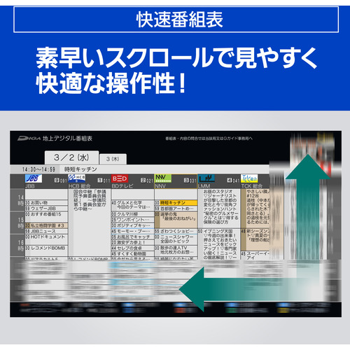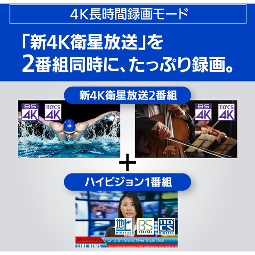 放送受信:チューナー数 3(地上デジタル/BS/BS4K/CS/CS110度4K 共用×2_地上デジタル/BS/CS 共用×1)、地上デジタル入力 VHF1〜12ch,UHF13〜62ch、CATV C13〜C63ch(CATVパススルー対応)、BS・110度CSデジタルIF入力、予約プログラム数(予約可能表示) 128番組(予約可能期間:1年間)
