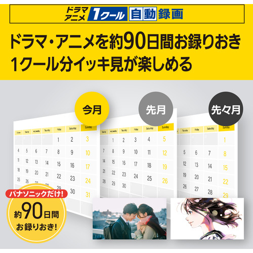 ●ドラマ・アニメを約90日間(※19時〜22時台に放送開始する地上デジタル放送のドラマを設定した場合。お録りおき日数は、1日あたり3時間分の番組を録画した時の日数です。お録りおき録画の設定が必要です。搭載チューナー数を超える同時録画はできません。※)お録りおき「ドラマ・アニメ1クール自動録画」搭載