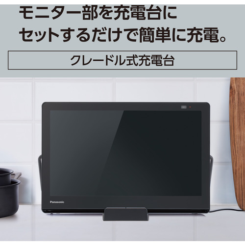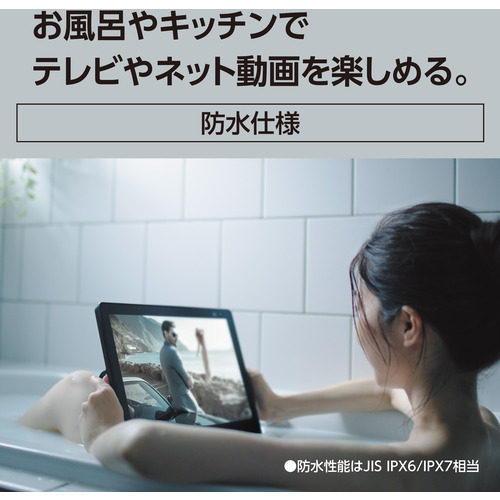 ・モニター部は防水仕様なので、お風呂やキッチンなどの水回りでも使用できる・防水タッチパネルなので録画や再生、チャンネル切換などの操作を画面にタッチでかんたん操作・モニター部にはバッテリーを搭載。最長約3時間(※テレビ放送視聴時。ヘッドホン使用、液晶画面の画質設定「ユーザー」明るさ「−5」時。エコ充電「切」で充電した場合。購入時の画質設定は「スタンダード」です。電池持続時間は使用条件によって短くなる場合があります。※)視聴できるので電源コンセントの場所を気にせず、 好きな場所に持ち運んで視聴できる。さらに充電台にセットしておけば、かんたんに充電ができる