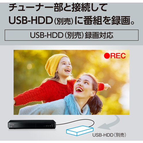 チューナー部 仕様:録画メディア:HDD(500GB)、録画圧縮方式:MPEG2 (DRモード) MPEG4-AVC/H.264 (1.5倍録〜15倍録モード)、録音方式:MPEG-2 AAC(最大5.1ch記録)、録画時間:HDD(DR(地上デジタル/HD放送:17Mbps):約62時間45分、DR(BSデジタル/HD放送:24Mbps):約44時間50分、DR(BSデジタル/SD放送:12Mbps):約89時間40分、1.5倍録:約67時間15分、1.6倍録:約71時間44分、1.8倍録:約80時間42分、2倍録(HG):約89時間40分、2.3倍録:約103時間7分、2.5倍録:約112時間5分、2.7倍録:約121時間3分、3倍録(HX):約134時間30分、3.5倍録:約156時間55分、4倍録(HE):約179時間20分、4.5倍録:約201時間45分、5倍録(HL):約224時間10分、5.5倍録:約246時間35分、6倍録:約269時間、7倍録:約313時間50分、8倍録(HM):約358時間40分、9倍録:約403時間30分、10倍録:約448時間20分、11倍録:約493時間10分、12倍録:約538時間、15倍録(HZ):約672時間30分)、入出力端子:アンテナ入出力端子(地上デジタル:75Ω F型コネクター BS/110度CS−IF:75Ω F型コネクター 電源供給 DC15V 最大4W )、HDMI AV出力(1系統)、USB端子(後面1系統、USB-HDD用) (DC 5V 最大500mA)、LAN端子(100BASE-TX、10BASE-T)
