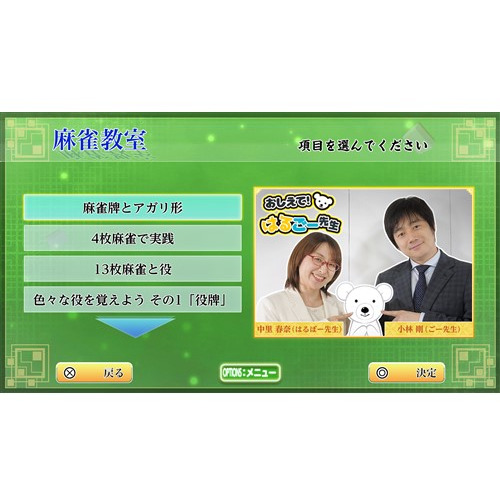 プロ雀士の『こばごー先生(小林剛プロ)』と『はるぼー先生(中里春奈プロ)』の二人が、 基本的な麻雀ルールの説明から、覚えておきたい役の作り方・鳴き方等を親切丁寧に教えてくれる麻雀教室!