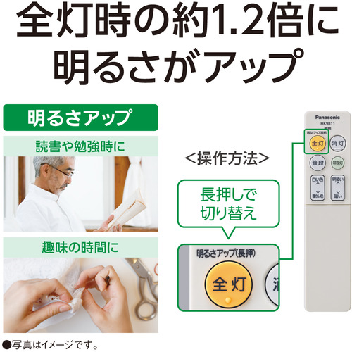 仕様:アクリルカバー(乳白つや消し) 専用リモコン送信器〔HK9811MM〕同梱 (リモコンボックス付) 光源寿命40000時間(光束維持率70%) リモコン【明るさアップ(全灯長押)・全灯・普段・常夜灯〈6段調光可能〉・滅】 リモコン送信器使用時のみ〈100%〜約5%〉調光・〈昼光色〜電球色〉調色可能・常夜灯(6段調光可能)↓↓壁スイッチ【普段→常夜灯】 AC100V (カバー取付け・ソフトターン方式) カチットF取付方式 水平天井専用 文字くっきり光 明るさアップモード時:定格消費電力38.4W 固有エネルギー消費効率 全灯時:134.3 lm/W(429 lm・32W)(定格値) 注)別売の傾斜天井アダプタ(HK9039)使用時、55度までの傾斜天井に取付可能 注)明るさアップモード時は全灯時より光束と消費電力が増加し、固有エネルギー消費効率が低下します。 注)光色によって、全光束・消費電力が変化します。 注)別売の竿縁天井取付アダプタ(HK9003)使用時、竿縁天井に取付可能