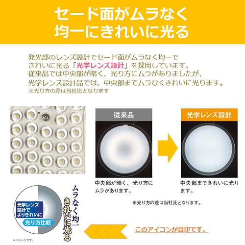 発光部のレンズ設計でセード面がムラなく均一できれいに光る「光学レンズ設計」を採用。中央部までムラなくきれいに光ります。