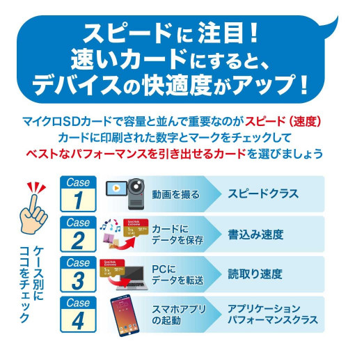 互換性:microSDHC/microSDXCおよびmicroSDHC/microSDXC UHS-I対応機器ホストで使用可能