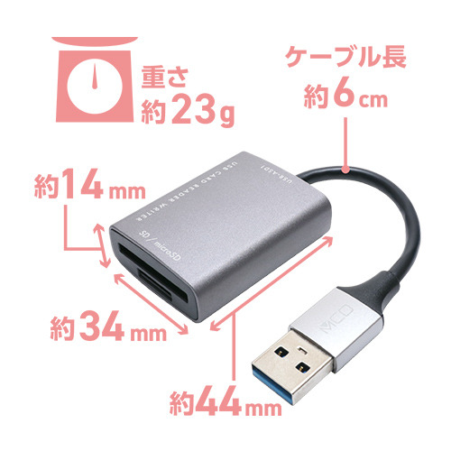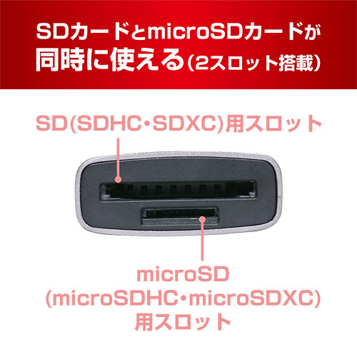 大容量のSDXC/microSDXC規格に対応しています。デジタルカメラなどで使用したSDカードのデータを読み込むことが可能です。