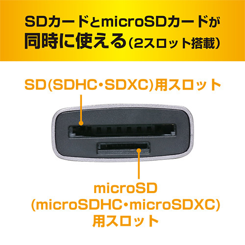 大容量のSDXC/microSDXC規格に対応しています。デジタルカメラなどで使用したSDカードのデータを読み込むことが可能です。