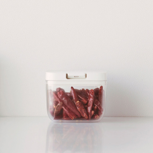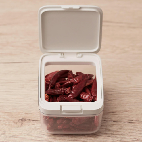 パッキンでしっかり閉まって湿気を防ぎ、ワンタッチで開く保存容器。
